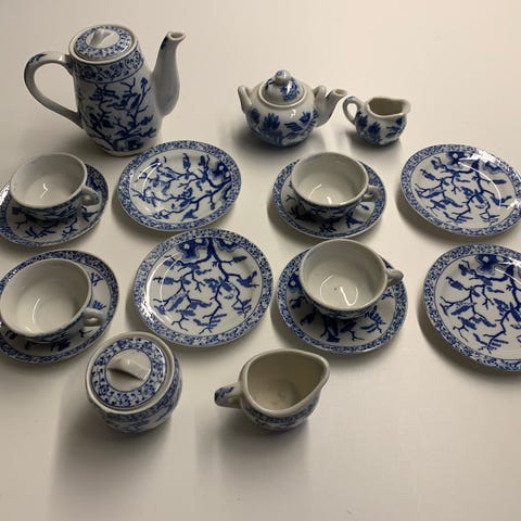 China Toy Tea Sæt i håndmalet porcelæn med blå og hvide mønstre. Sættet indeholder flere kopper, underkopper, tekande, sukker- og flødekande. Designet til leg og samling.det er i original emballage fra 1970 og i rigtig fin stand til the selskabet med bamser og dukker