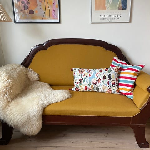 Antik sofa fra 1925, god stand, smukke detaljer og nylig ombetrukket med gul polstring. Med til sofaen hører to stole uden armlæn og et ovalt bord. Klassisk sofagruppe fra "fin" stue i 1920'erne. Sælges samlet (den angivne pris) eller evt. enkeltvis (hør her om priser for enkeltdele).