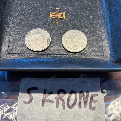 Flot 5 Kroner fra 1969 med portræt af Frederik IX og inskriptionen 'FREDERIK IX KONGE AF DANMARK'. Bedste år i serien.