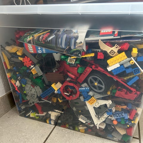 Nogle af sættene er helt samlet, andre er delvist adskilt. Men alle klodser er der. Mange sorteret i kasse.