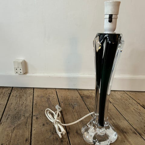 Fantastisk flot lampe i klar og blå glas, måler 36 cm incl fatning, der er et lille slag på 2mm nederst. Ses næsten ikke.