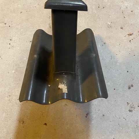 Metal tagrendeafløb med integreret taggennemføring og sideudløb. Produktet er fremstillet af sort metal og designet til installation på tagrender for effektiv afledning af regnvand. Indeholder svejsede samlinger og er egnet til montering på tage med bølgeformede tagmaterialer.