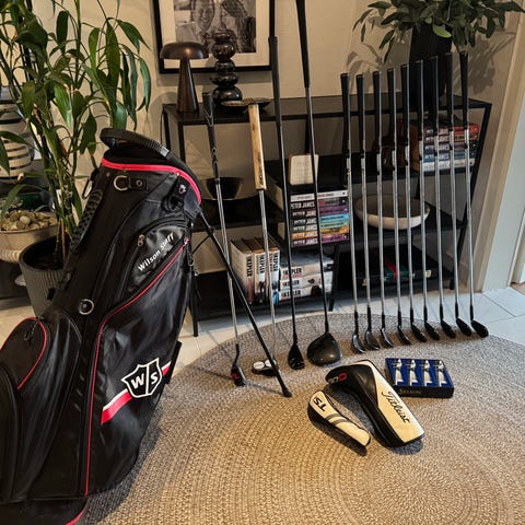 Komplet sæt oggolfbag. Sættet indeholder også en foldbar golfvogn, flere golfbolde i forskellige farver,