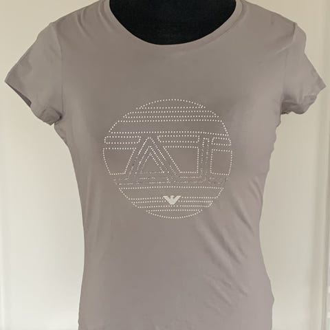 Armani T-shirt eller bluse i flot gul farve og med meget korte ærmer. Blusen er på brystet med et motiv, der viser skriften Armani Jeans i adskillige farver se billede 2. Der er desuden et mindre firmasymbol nederst til venstre i sidesømmen på blusen se billede 3. T-shirten er i størrelse 44, det modsvarer italiensk størrelse 50 og brystmålet er cirka 96 cm, medens længden er cirka 56 cm. Blusen er fremstillet af 95% bomuld og 5% elastan.