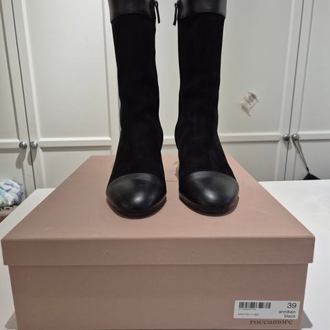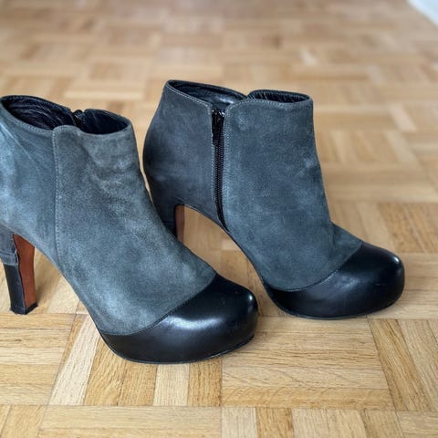 Smukkeste ankelstøvle med stilethæl i ruskind og skind. Meget lidt brugt og i superflot stand - bortset fra lidt slid yderst på snuderne. Ikke noget man lægger mærke til når de er på.