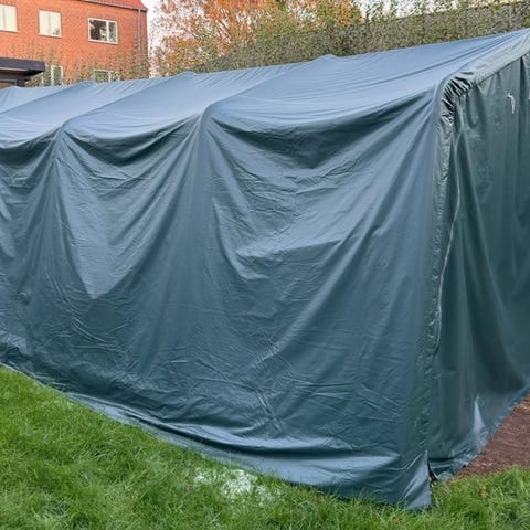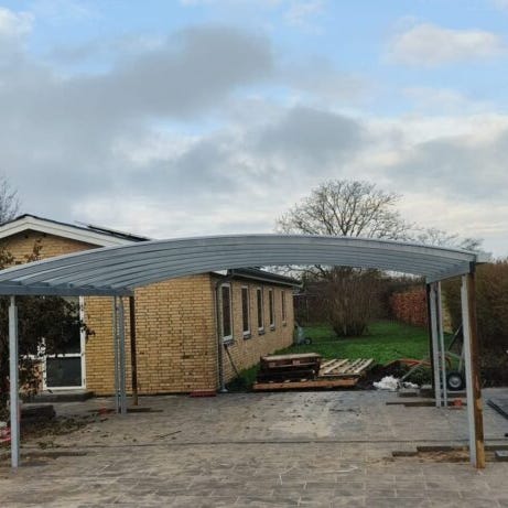 5x10 m. Overdækket, samt dækket i den ene ende. Åben i den anden.