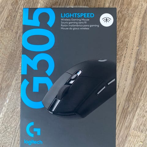 Logitech G305 trådløs gamingmus i sort farve. Musen har en kompakt og ergonomisk form, optisk sensor og trådløs USB-modtager. Velegnet til gaming og almindelig brug.