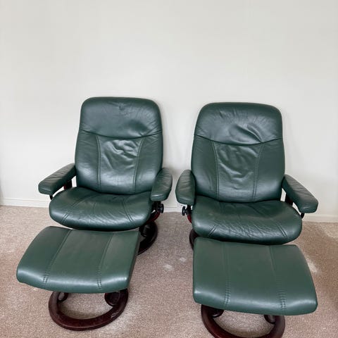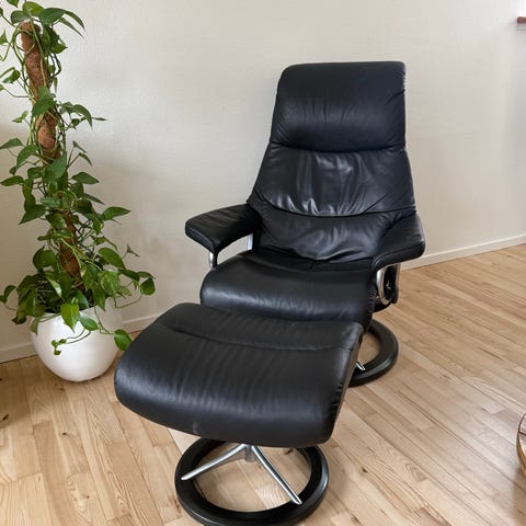 Flot og elegant lænestol betrukket med Paloma læder i fraven, Maroon. Stolen er med et sortbejdsede egetræsstel og inkluderer en matchende skammel.