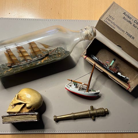 Sjældne miniature metal skibe, 3 med skorsten og 2 sejlskibe.
