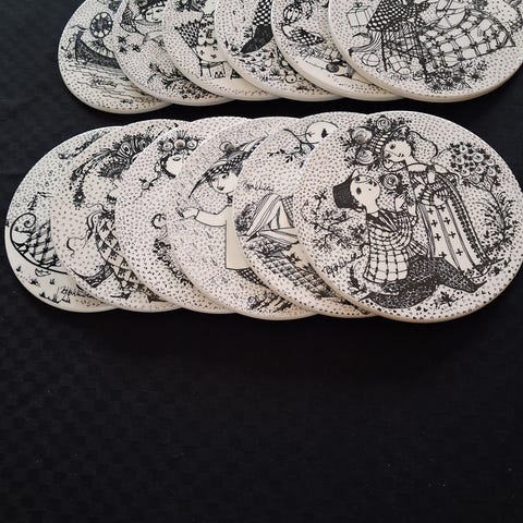 Wiinblad månedsplatter i keramik bestående af 9 stk. Hver plade har unikke, sort-hvide illustrationer med tema og er designet som ophæng. Ca.15cm ø