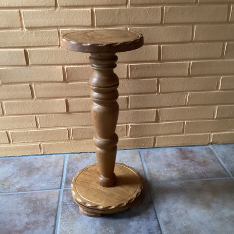 Træ Stativ til Blomster i oliebehandlet eg. Rundt stativ med en højde og en stabil base med fire ben. Velegnet til indendørs brug som blomsterholder eller dekorativt møbel. Højde 54,5 cm, diameter 22 cm.