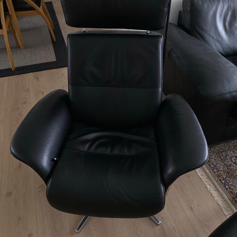 Flot Stresless lænestol med skammel i en smuk læder beige farve.