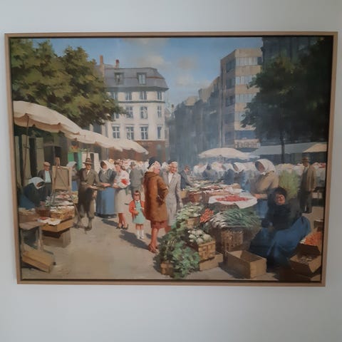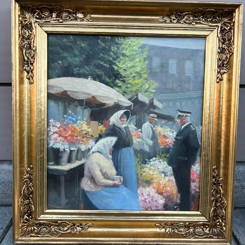 Blomsterkonerne på Højbro Plads, Søren Bjulf (1890-1958) , ca. 1930, olie på plade, 58x65 ( 54x47), 9.500 kr.