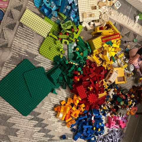 2 poser Duplo: Gravemaskiner, biler, vilde dyr, folk, plader og klodser i fede farver. Fejler intet.