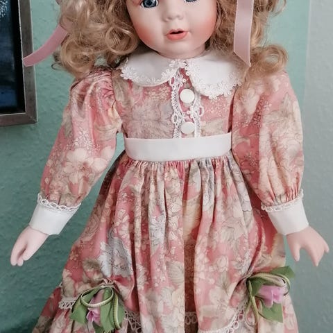Dukker, Porcelænsdukke, Dukke med porcelænshoved. 65 cm. Alle fingre og tæer intakt. Ca. 1930. Originale lædersko og undertøj. Paryk fra ca. 1960. Åben mund til lille sut. Øjne kan lukkes.