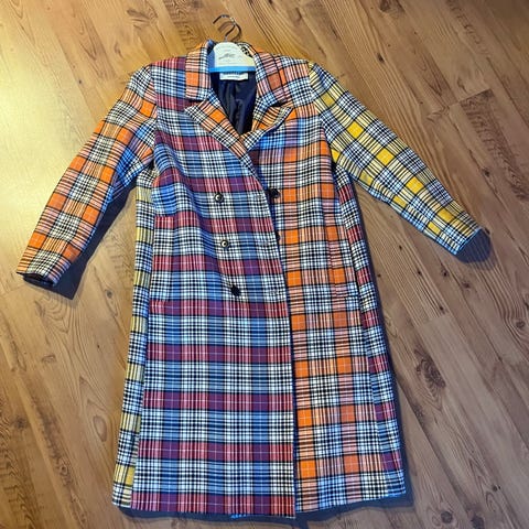 Mads Nørgaard Frakke i beige farve, størrelse 38 til kvinder. Jakken har hætte og flere lommer, designet til at give beskyttelse mod vind og vejr. Materialet er robust og velegnet til daglig brug.