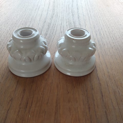 Keramik lysestager med hvid glasur, mærket L Hjorth 676, af ældre dato