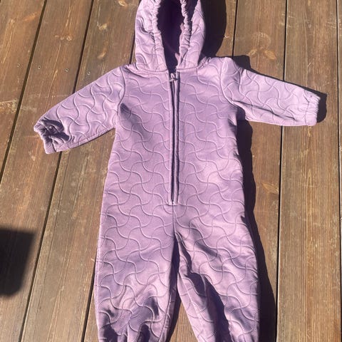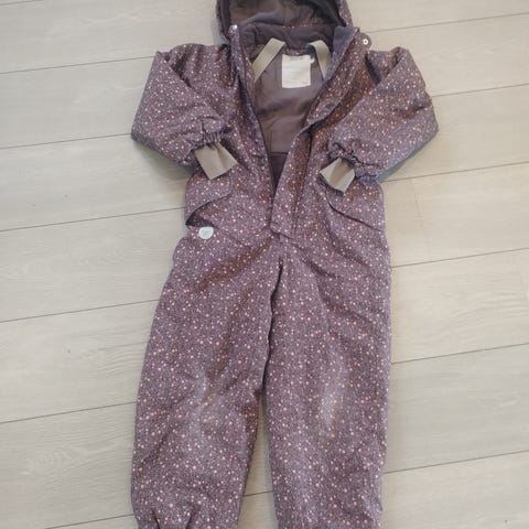 Wheat børnedragt i størrelse 86 til pige i beige farve med blomsterprint. Dragten er lavet af genanvendte materialer og har en quiltet struktur. Den har hætte og lynlås foran, designet til udendørs brug og leg for nysgerrige børn.