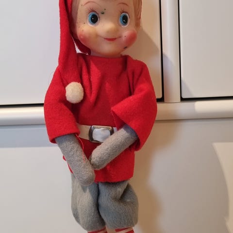 Rigtig pæn nissedukke med bluse og nederdel i stof og med lang nissehue H 36 cm