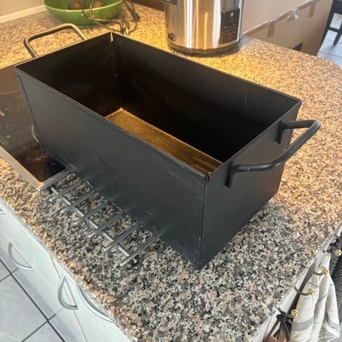Metalkasse til aske fra brændeovnen. Brovst Blikvarer A/S. Fint til blomster/planter. Håndtag i hver ende. Størrelse 22x42x19 cm. Kraftig model. Askeskuffe.