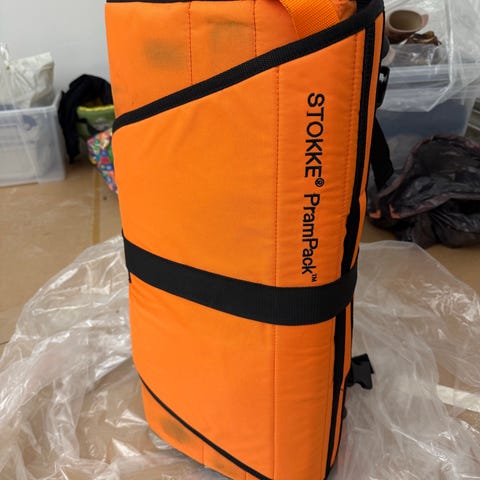 Stokke prampack sælges. Kan indeholde barnevogn, klapvogn eller søskendevogne (bl.a. Bugaboo Donkey duo) og sikrer dine køretøjer på rejser. Er beskidt og har synlige brugsspor, men fungerer helt som den skal.