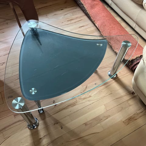 Flot sofabord i glas m/rustfri stål ben sælges.