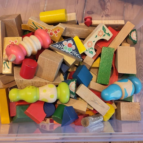 Store, små, aflange og buede klodser - i træfarver og malede.