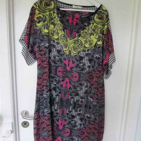 Mønstret i grå, bordeaux, sand, sort. Str XL, længde ca 140 cm. brugt 1 gang.