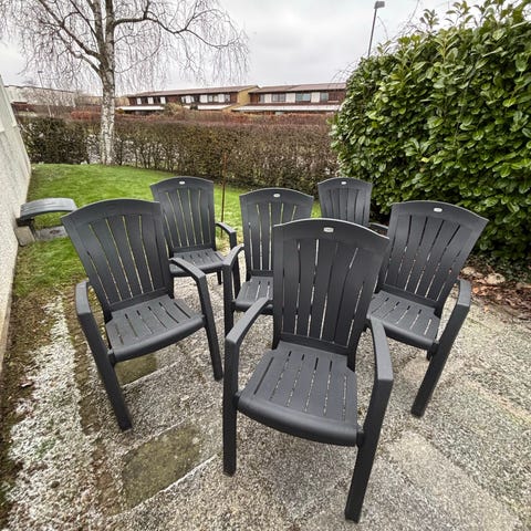 5 lette havestole i sort metal og net. Stolene er stablebare og velegnede til udendørs brug i haven eller på terrassen. Nypris 150kr pr stk. Samlet pris for alle 5 = 200kr.