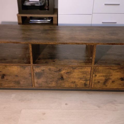 TV-bord i træ med masser af opbevaringsplads. Dørhængslerne var i stykker, så vi måtte fjerne dem. Nu holdes de på plads af magneter, men kan repareres.