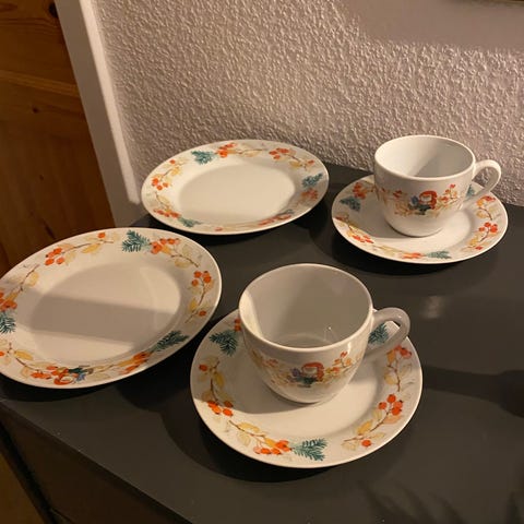 De fineste julekopper med tegninger af Mads Stage. I alt 8 kopper, underkopper og side-/kagetallerkener. Så er julekaffebordet dækket på fineste vis.