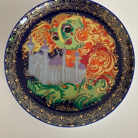 7 stk. Sæt bestående af 7 runde platter med detaljerede, farverige illustrationer og gulddetaljer langs kanten. Tallerkenerne har kunstneriske motiver med figurer og blomster i levende farver på en mørk baggrund. Materialet er porcelæn, og de er velegnede til samling eller dekorativ brug.