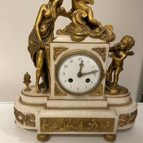 Utroligt smuk fransk kaminur af Samuel Marti, med en kæmpe figur. Uret er fra ca. 1870. Standen er fremstillet af marmor, mens selve figuren er lavet af bronze. Figuren har separate signaturer fra uret, og der står "inspireret af Francois Moreau".