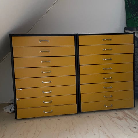 2 arkivmoduler med 2 skuffer i hver. Der er tilskåret plade i bunden, så de kan bruges til opbevaring.