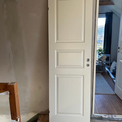 Hvid indvendig dør fra Swedoor (celledør ) i målene 204x82,5x3,9. Med beslag til hængsler.
