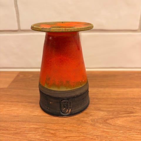 Flad oval stage med hul i midten til kalenderlys. Dekoreret med flere farvet silketryk.
