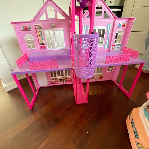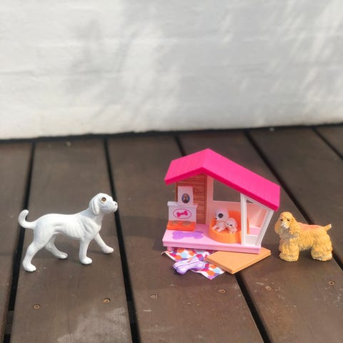 Barbie legetøj bestående af et hundehus i pink og hvid samt to hundefigurer. Legetøjet er velegnet til børn og kan bruges til rolleleg og udvikling af fantasi.