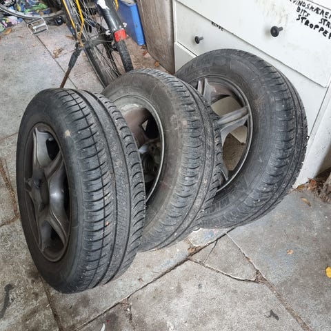 Sommerdæk på fælge, passer på VW Up og andre mindre biler med 100 mm krydsmål.