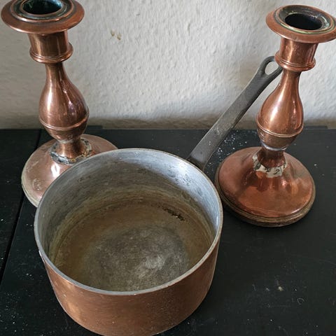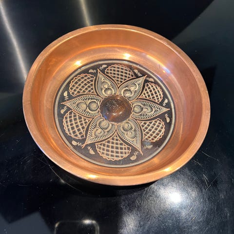 Antik, ældgammel glødeskål af kobber og træ, primitivt dekoreret.