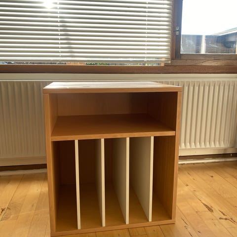 Smal reol i træfinér med 3 små skuffer. Prisen er en afhentningspris.