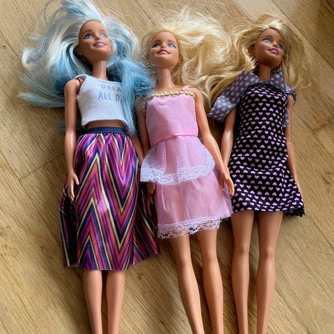 Barbie Dukker (3 stk) Sæt med tre dukker iført forskellige kjoler i flere farver og mønstre. Dukkerne er designet til børn og kan bruges til leg og samling.