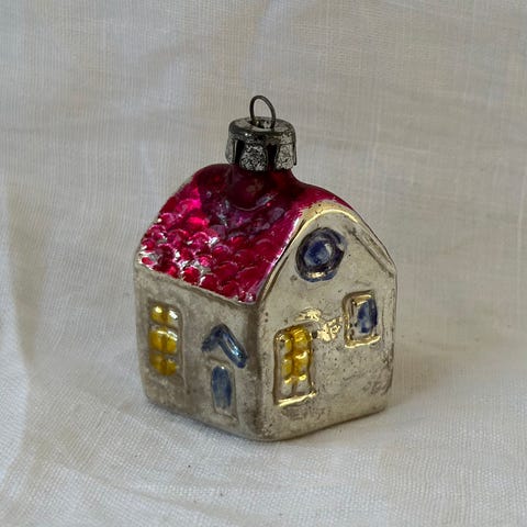 Gammelt glas julepynt - julehus, Gamle glas julekugler - jule hus. Den håndlavede julekugle er udført i mundblæst glas og er formet som et smukt julehus fyldt med de fineste detaljer på de fire sider såsom døre og vinduer, sne mv. Den gamle julekugle er i en smuk lyserød farve. Med ophæng til at hænge på juletræet.
