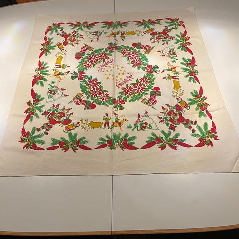 Retro juledug i bomuld. Blå med røde nisser i grankrans. Måler 83x78cm og er i pæn stand. Pris kr 35
