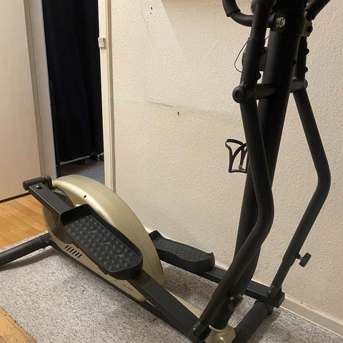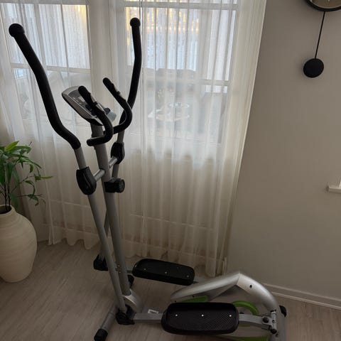 Christopeit Sport Crosstrainer fitnessmaskine med sort stel og håndtag. Udstyret med digitalt display til visning af tid, afstand, hastighed og kalorieforbrug. Maskinen har justerbar modstand og fodpedaler med skridsikre overflader. Velegnet til konditionstræning i hjemmet.