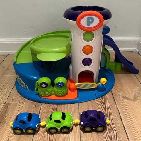 Blandet legetøjssæt bestående af flere køretøjer inklusiv brandbiler og traktor samt et legetårn med rutsjebane. Materiale: plast. Farver: rød, gul, grøn og blå. Designet til børn og egnet til leg og motorisk udvikling. 200 for det hele eller byd på enkelte ting. Bare det kan bruges af andre😊