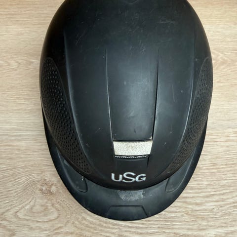 USG Ridehjelm i mat sort farve, størrelse S/M (52/56). Hjelmen har justerbare stropper og polstret inderside for komfort og sikkerhed.