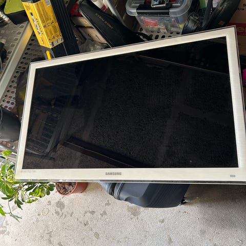 Samsung TV fladskærm i sort farve. Skærmen er stor og velegnet til hjemmeunderholdning. Produktet inkluderer tilslutningskabler og har et moderne design.
