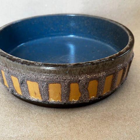 Meget lækker retro bordskål med dem smukkeste blågrønne glasur indvendig. Fra østtyske Strehla og i rigtig pæn brugt stand. Ingen skår eller afslag blot de alderstypiske glasurkrakeleringer i bunden. Ses næsten altid i den blanke glasur. Kr 200,-