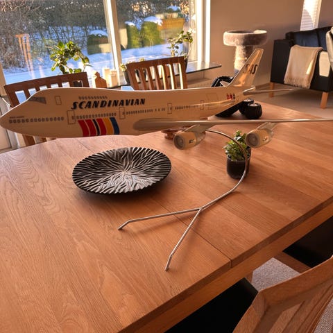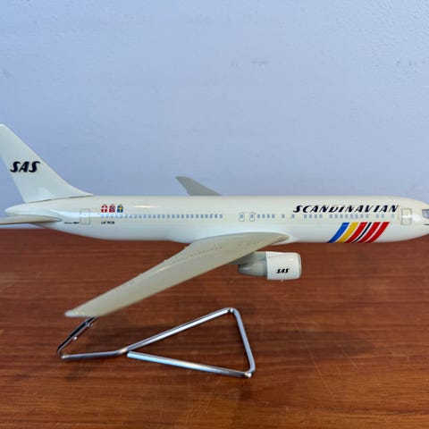 Modellen er i plastik med medfølgende metalstander – en rigtig display-model af den type, der blev brugt hos flyselskaber og rejsebureauer.