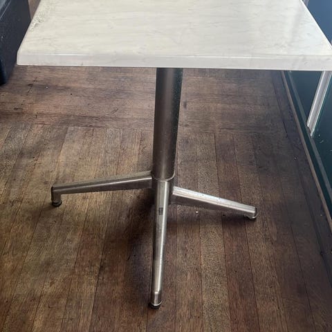 De har været brugt som caféborde, men står stadig pænt og stabile uden skader. Perfekte til café, restaurant, butik, personalerum eller hjemme som små sofaborde/sideborde.